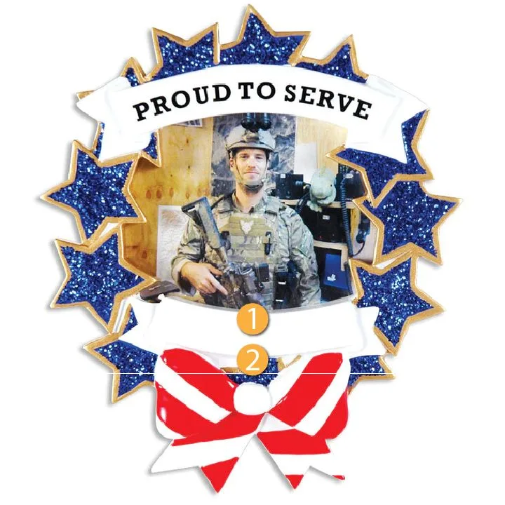 PolarX Personalized Armed Forces Frame Ornament would be a great addition to your Christmas tree, especially if you want to show some love to those who are serving. This ornament features glittery blue stars and a red and white bow border with the message, "Proud to Serve" above a frame that can hold a picture of a loved one. A hook is attached to its top so you can easily tie a ribbon to hang it. This ornament would also be a great gift idea for family and friends who have someone or know someone serving our country. Personalization gives you the opportunity to add any sentiment in a unique way so you can create lasting and loving memories.