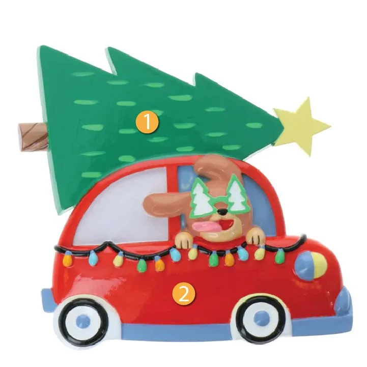 PolarX Personalized Dog in Car with Tree Ornament would be a great addition to your Christmas tree, adding a festive flare to it. This ornament features a happy dog sticking its head out of a decorated car window that is transporting a Christmas tree. A hook is attached to its top so you can easily tie a ribbon to hang it. Personalization gives you the opportunity to add any sentiment in a unique way so you can create lasting and loving memories.