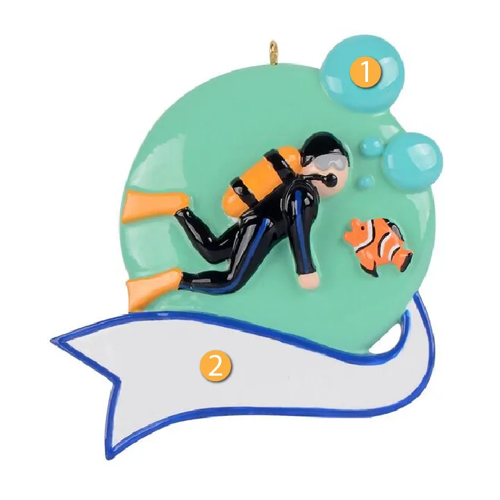 Rudolph & Me Personalized Scuba Diver Ornament would be a great addition to your Christmas tree, especially if you enjoy diving down deep into the ocean. This ornament features a suited-up and equipped scuba diver swimming with a fish. There are plenty of spaces where you can write a personalized name or message. For convenience, there is a hook at the top of this ornament so you can easily put a ribbon through it to place it on the tree. A great gift idea for a family member or friend who enjoys scuba diving or wants to remember their first scuba diving experience!
