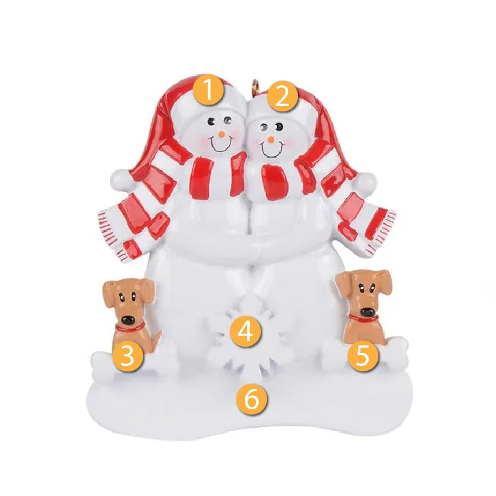 Rudolph & Me Personalized Snow Couple with 2 Tan Dogs Ornament is the perfect decoration for those who want to show some love for their furry friend. This ornament features a snowman couple embracing with their two tan dogs below them on a snow pile. There is plenty of white space that gives you a place to write a personalized name or message. Great gift idea for couples with tan dogs or who have just become new dog owners!
