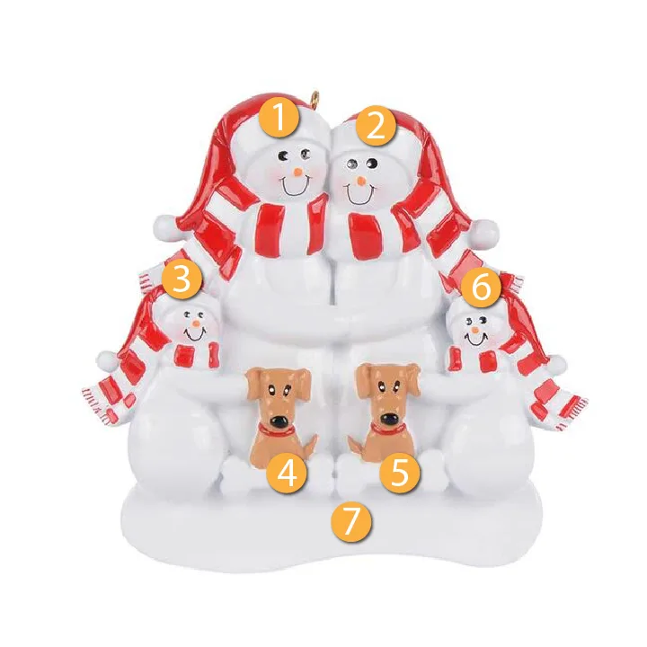Rudolph & Me Personalized Snow Family of 4 with 2 Tan Dogs Ornament is the perfect decoration for those who want to show some love for their furry friend. This ornament features a snowman family of four embracing with their two tan dogs below them on a snow pile. There are plenty of white spaces that give you a place to write a personalized name or message. Great gift idea for the family of four in your life who owns tan dogs!