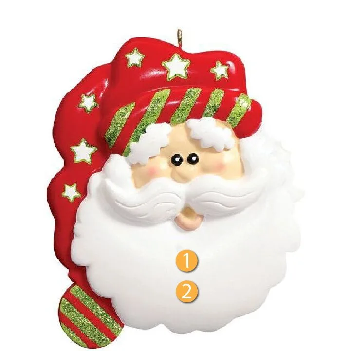 Rudolph & Me Personalized Santa Face with Stars Ornament is the perfect decoration for those who want to add some extra decoration to their Christmas tree. This ornament features a jolly Santa face wearing a festive hat that is accented with stars and red and green stripes. There is plenty of white space that can act as a spot for you to write a personalized name or message.