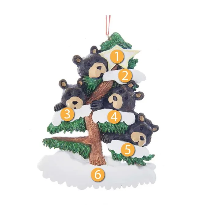 Kurt S. Adler Personalized Bear Family of 4 on Tree Ornament would be a great addition to your Christmas tree, especially if you want to show some love for your family of four. This ornament features a black bear family of four sitting in a snowy tree on a snow drift with a festive star tree topper. A red ribbon is attached to its top so you can easily hang it. This ornament would also be a fun gift idea for a family of four. Personalization gives you the opportunity to add any sentiment in a unique way so you can create lasting and loving memories.