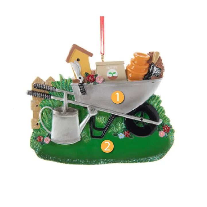 Kurt S. Adler Personalized Gardening Ornament would be a great addition to your Christmas tree, especially if you love to garden. This ornament features a wheel barrel filled with assorted gardening tools on a patch of glittered grass. A red ribbon is attached to its top so you can easily hang it. This ornament would also be a great gift idea for the gardeners in your life. Personalization gives you the opportunity to add any sentiment in a unique way so you can create lasting and loving memories.