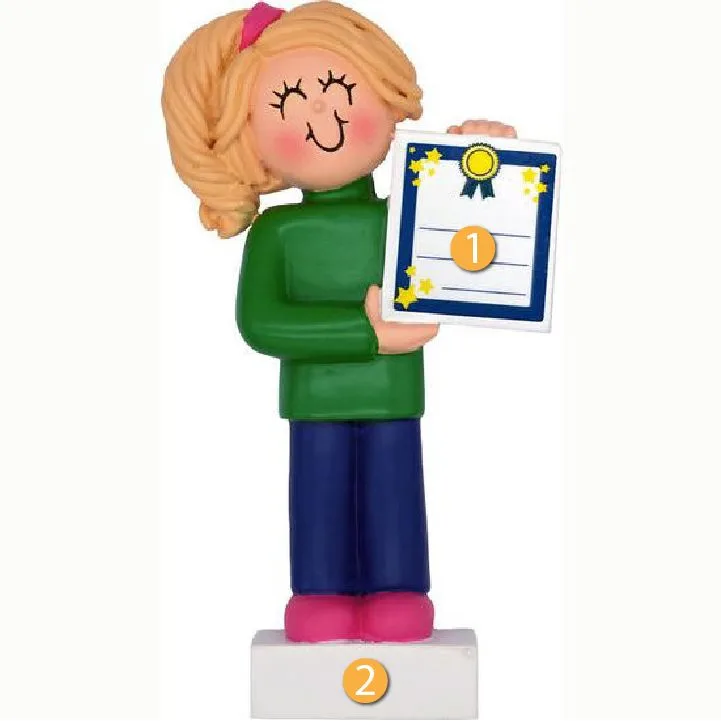 Ornament Central Personalized Blonde Female Child with Award Ornament would be a great addition to your tree, especially if you want to highlight an accomplishment of your little one. This ornament features a blonde female child holding up some sort of award or certificate that she is proud of. Open and white spaces allow you to personalize this ornament with a name or message. Great for a family member or friend whose little one just celebrated a big accomplishment!