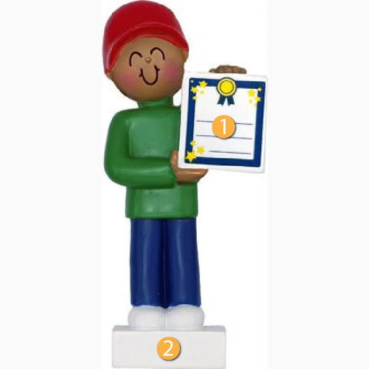 Ornament Central Personalized African American Male Child with Award Ornament would be a great addition to your tree, especially if you want to highlight an accomplishment of your little one. This ornament features a male child holding up some sort of award or certificate that he is proud of. Open and white spaces allow you to personalize this ornament with a name or message. Great for a family member or friend whose little one just celebrated a big accomplishment!