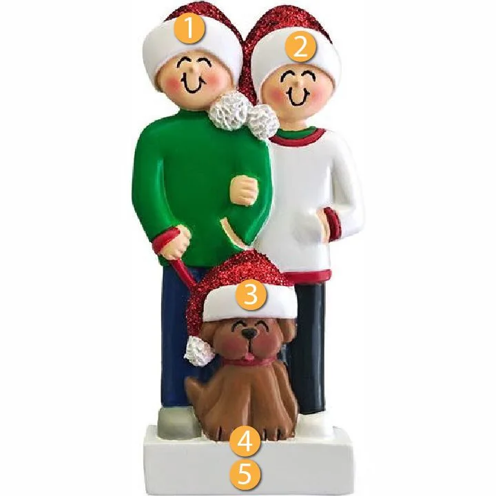 Ornament Central Personalized Couple with Brown Dog Ornament is the perfect decoration for those who want to show some love for their furry friend. This ornament features a couple with their dog on a leash wearing matching Santa hats. There is plenty of white space that gives you a place to write a personalized name or message. Great gift idea for couples with a brown dog or who have just become new dog owners!