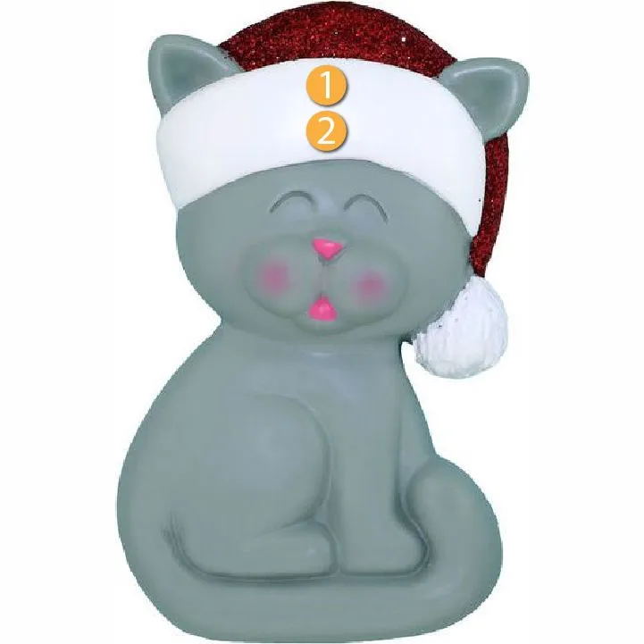 Ornament Central Personalized Gray Cat with Santa Hat Ornament is the perfect decoration for those who want to show some love for their furry friend. This ornament features a gray cat sitting with its eyes closed wearing a sparkly Santa hat. The white space on the hat can be a place for you to write a personalized message or name. Great gift idea for a family member or friend who has a gray cat.