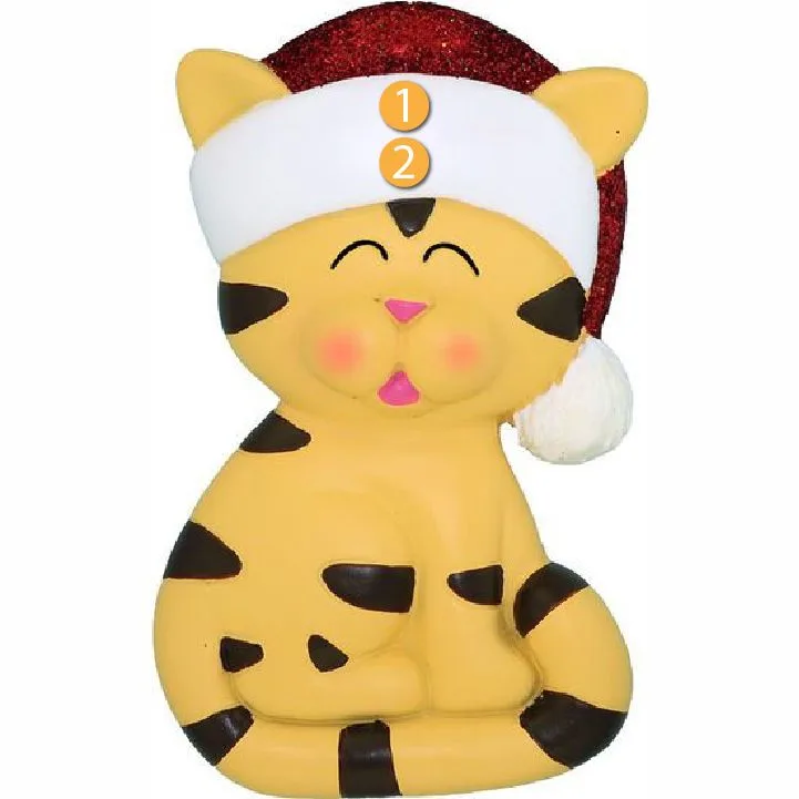 Ornament Central Personalized Tiger Cat with Santa Hat Ornament is the perfect decoration for those who want to show some love for their furry friend. This ornament features a Tiger cat sitting with its eyes closed wearing a sparkly Santa hat. The white space on the hat can be a place for you to write a personalized message or name. Great gift idea for a family member or friend who has a Tiger Cat.
