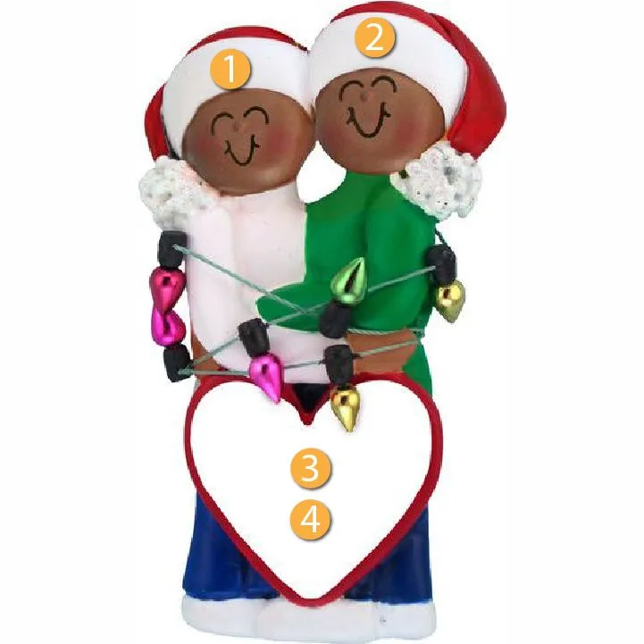 Ornament Central Personalized African American Christmas Couple Ornament is a fun addition to your Christmas tree decor to show some love for your significant other. This ornament features a couple wearing matching Santa intertwined with a string of colorful lights. There are several white spaces that allow you to write a personalized name or message. Great gift idea for your significant other!