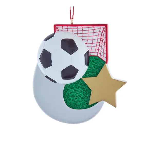 Kurt S. Adler Personalized Soccerball with Star Ornament would be a great addition to your Christmas tree. This ornament features a soccer ball flying into a net. A red ribbon is attached to its top so you can easily hang it. This ornament would also be a great gift idea and custom personalization gives you the opportunity to add sentiment in a unique way so you can create lasting and loving memories.