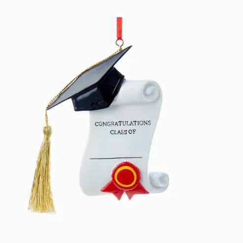 Kurt S. Adler Personalized Graduation Diploma Ornament would be a great addition to your Christmas tree. This ornament features an unrolled diploma with a grad hat and moving tassel. A red ribbon is attached to its top so you can easily hang it. This ornament would also be a great gift idea and custom personalization with the year of graduation and name and gives you the opportunity to add sentiment in a unique way so you can create lasting and loving memories.