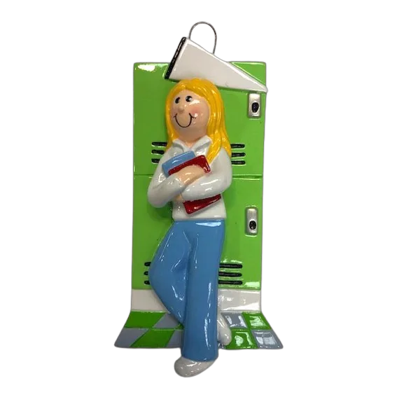 Rudolph & Me Personalized Blonde Hair Female at School Ornament would be a great addition to your Christmas tree. This ornament features a teenage girl leaning against green lockers with a pennant flag above her head. This ornament would also be a great gift idea and custom personalization gives you the opportunity to add sentiment in a unique way so you can create lasting and loving memories.
