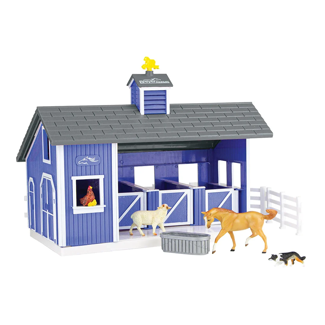 Breyer Farms™ Home at the Barn Playset is an exciting new playset. It features a 3-stall barn complete with fencing, a dog, a sheep, a hen with chicks, a Stablemates horse, and water trough. 1:32 Scale. Suitable for ages 4 and older.