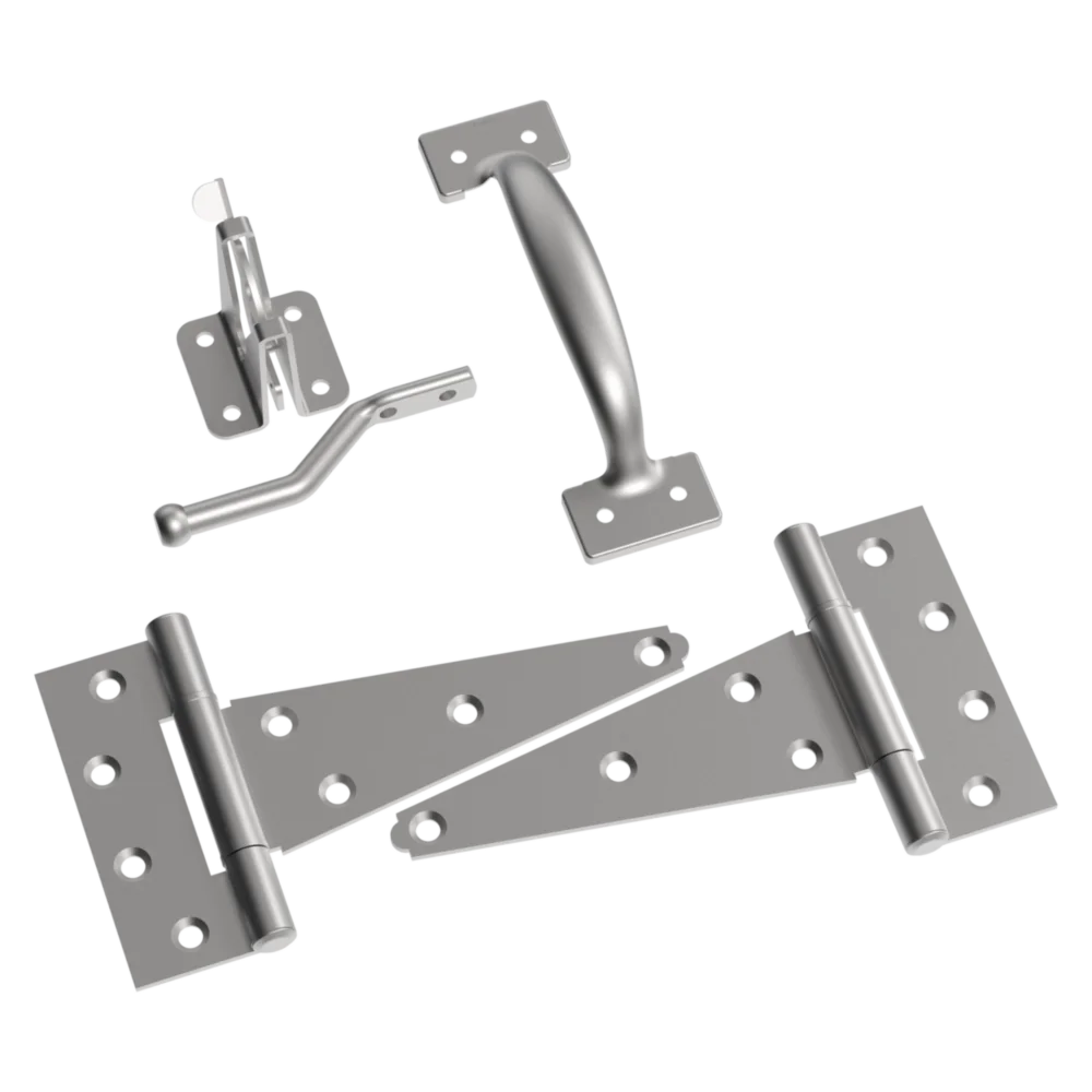 National Hardware's galvanized gate kit is used for a variety of installations including doors and gates. Galvanized finish for ideal outdoor use. Mounting hardware included for easy installation. Kit Includes (1) Gate Latch, (2) T-Hinges, (1) Pull, and associated mounting hardware. For exterior applications. Coated with Weatherguard Protection to withstand harsh weather conditions and prevent corrosion. National Hardware's Lifespan Limited Lifetime Warranty.