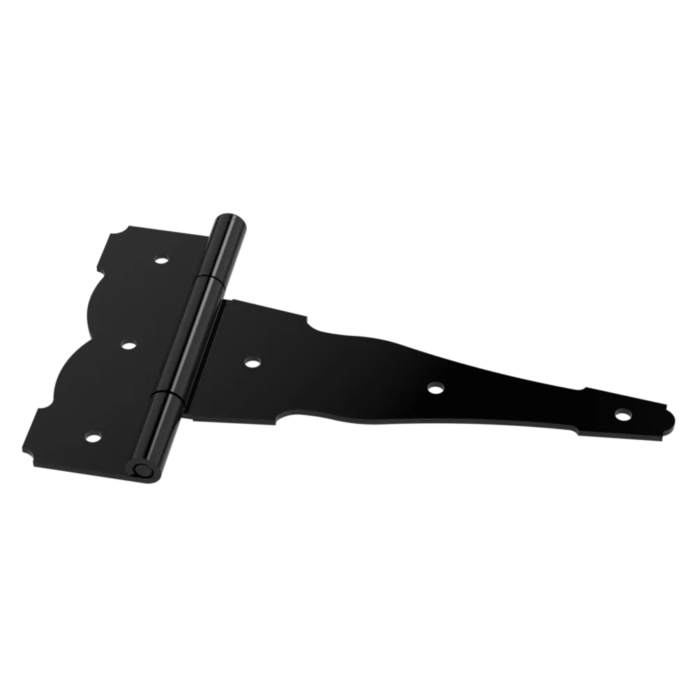 National Hardware's 10 In. decorative T-hinge in black is used for gates, sheds and rustic doors. Offset screw holes for extra strength and to prevent wood from splitting. Black finish for style and durability. Mounting hardware included for easy installation. For both left and right handed applications. For exterior applications. Coated with Weatherguard Protection to withstand harsh weather conditions and prevent corrosion. National Hardware's Lifespan Limited Lifetime Warranty.