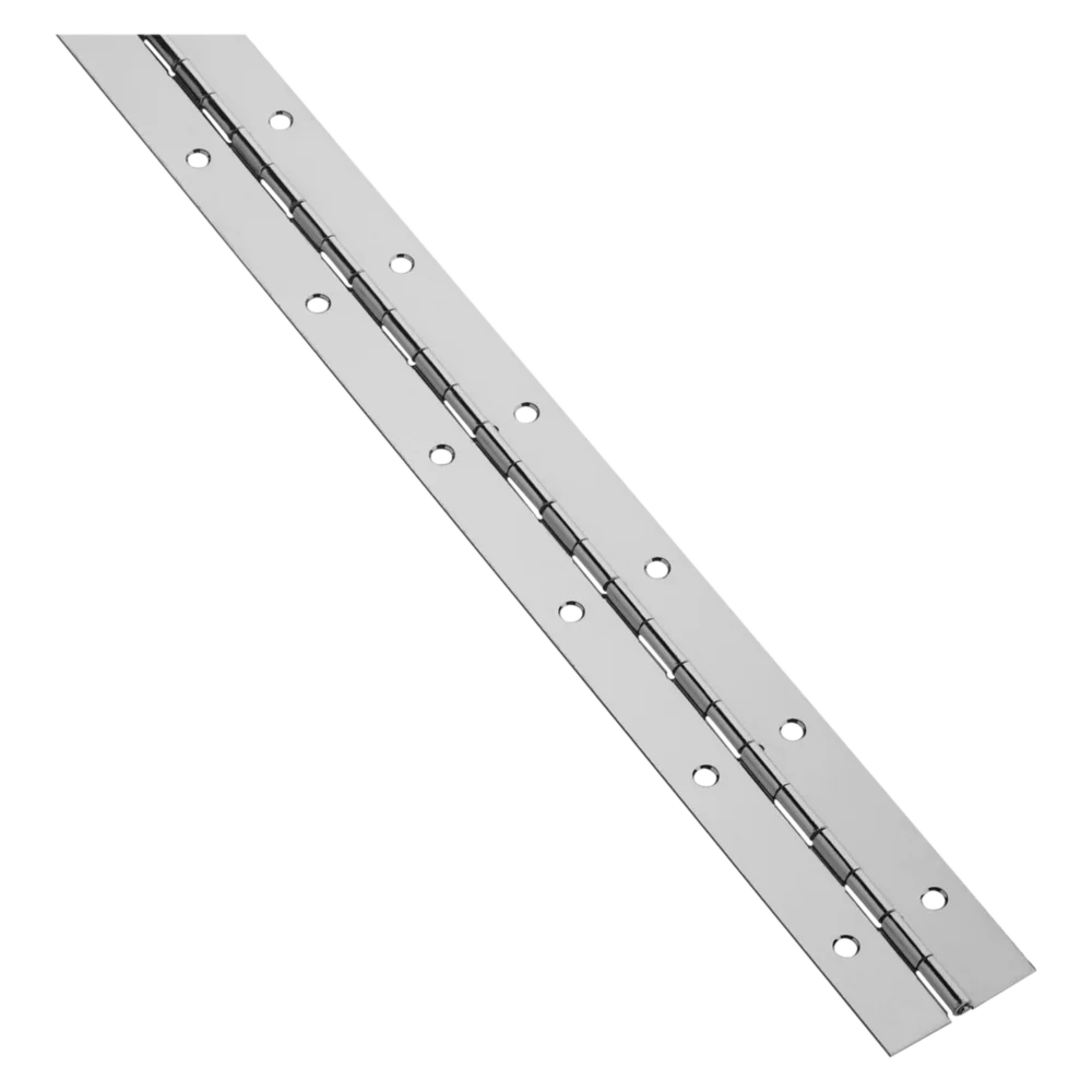 Catalog model No. V571 series. For use on tool sheds, cabinets, folding tables, chest, and marine applications. Can be cut to any desired length. Stainless steel friction pin will not fall out. Screwholes spaced 2" apart diameter, resists rust. Packed 1 unit to a visual pack with stainless steel screws. Finish: 304 brite, annealed stainless steel. Not for use in food service industry.