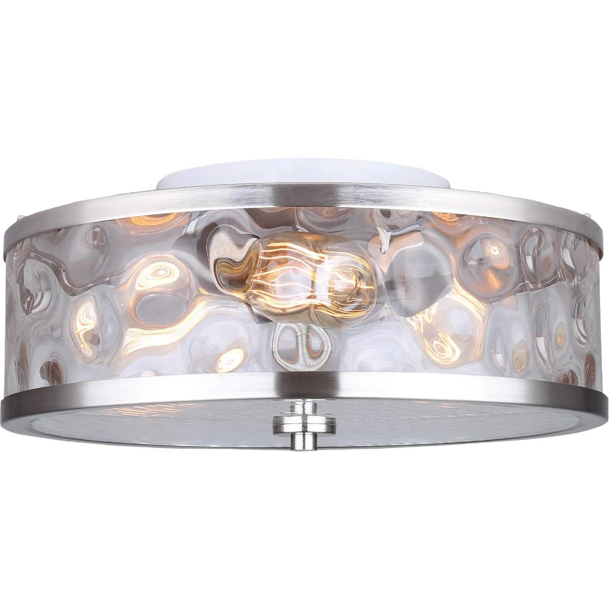 Stylish flush mount ceiling light fixture. Features a sleek, contemporary design that fits in with a wide variety of home decor. Requires (3) 60 watt Type A incandescent light bulbs, not included. Also compatible with LED (light emitting diode) or CFL (compact fluorescent) light bulbs. Canopy is 7-3/4 inches in diameter. Shade is 15-1/4 inches wide x 4-3/4 inches high featuring water mark glass with glass diffuser. Ceiling mounted using Easy Connect installation. No. IFM677A15BN: Size: 16 In. W. x 6-3/4 In. H., Finish: Brushed Nickel, Number of Bulbs: 3 Bulbs, Bulb Type: Incandescent, Bulb Shape: Type A, Base Type: Medium, Bulbs Included: No, Compatible With: LED, CFL, Dimmable: No, Wattage: 60W, Voltage: 120V, Shade: Water Mark Glass, Material: Steel, Hardware Included: Yes, UL Listed: Yes, Pkg Qty: 1, Package Type: Box