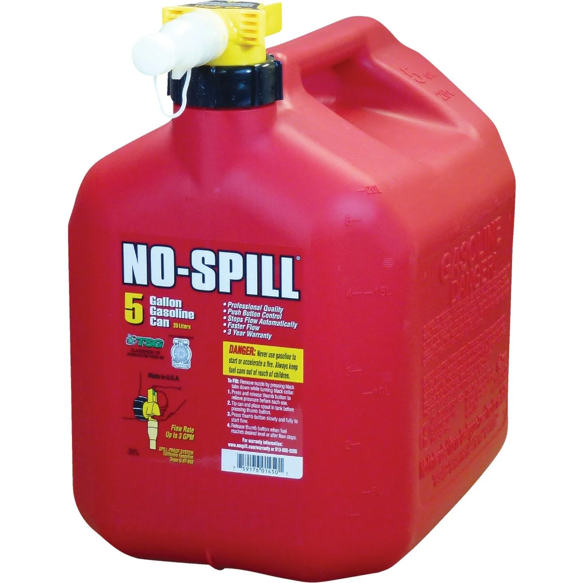 No-Spill fuel cans are tested and certified to meet standards and specifications for portable fuel containers for consumer use. Professional quality. Patented self-venting, self-sealing nozzle; just pick up, tip, and press the button to pour. Flows up to 3 gallons per minute. Nozzle stops flow automatically when the tank reaches full. Unique features include quart and liter markings molded into the can for easy reference and mixing. Tapered 7/8 OD (outside diameter) spout has a 20 mesh stainless steel screen in the spout to filter out debris while pouring. Dust cap attached to protect spout from dust and debris when not pouring. Flex spout attachment, sold separately, will allow filling of vertical openings easier. CARB (California Air Resources Board) and EPA (Environmental Protection Agency) compliant. Model 1450: Fuel Type: Gasoline, Capacity: 5 Gal., Material: Plastic, Color: Red, Dimensions: 17-1/2 In. x 11-1/4 In. x 14 In., Grade: EPA & CARB, Pkg Qty: 1