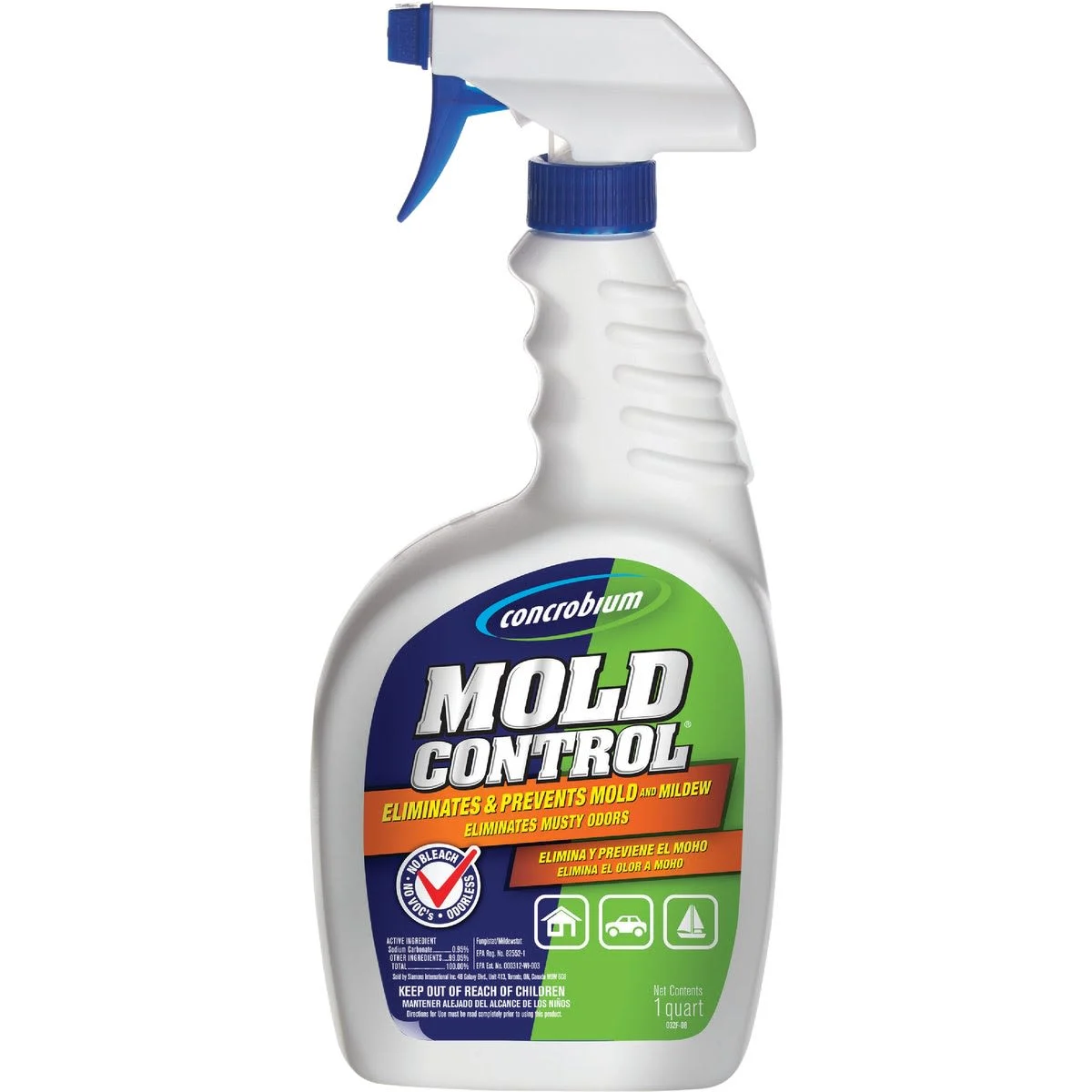 Odorless and colorless Concrobium Mold Control eliminates existing mold problems and leaves surfaces with an invisible antimicrobial shield that prevents new mold and mildew growth. Contains no ammonia, bleach, or VOCs and is EPA-registered and Health Canada approved. Ideal for household mold clean up and prevention, pretreating building materials during construction, eliminating mold problems found during renovation, ensuring mold prevention following flooding or water damage, and gets rid of musty smells. Works on drywall, concrete, wood, masonry, siding, shingles, stone, grout, plastic, tile and many more surfaces. Ideal for basements, bathrooms, laundry rooms, attics, closets, garages, windows, car interiors, boat interiors and RVs. Effective on hard and fabric surfaces. Eliminates musty odors. Odorless and colorless. Can be fogged to treat large, inaccessible areas. Model 025-326: Size: 32 Oz., Type: Trigger Spray, Coverage Area: 300 to 500 Sq. Ft., Depends on Surface, Pkg Qty: 1, Package Type: Bottle