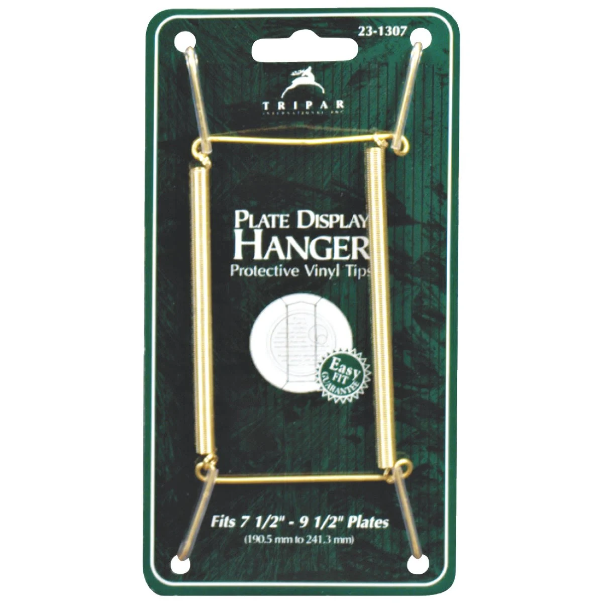 Tripar 7-1/2" to 9-1/2" Brass Wire Plate Hanger is designed for displaying plates or tiles on your wall. It features sturdy wires with a brass finish and clear plastic-coated tips that securely grip and protect the edges of the plate. These hangers are connected by a flexible coiled wire, allowing them to easily conform to the shape of most plates, including round, oval, and scalloped ones. The hanger can hold up to 2 lbs of weight, and it comes with a hook and nail for easy installation on your wall, making it an ideal choice for showcasing decorative plates or tiles in your home.