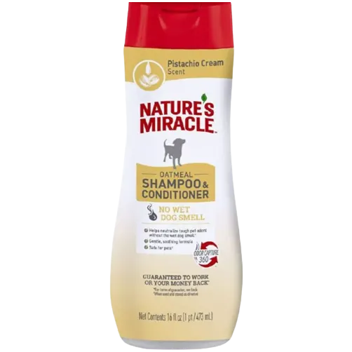 Nature's Miracle Oatmeal Supreme Odor Control Shampoo is a 4-in-1 solution for your pet's skin and coat. This natural oatmeal shampoo neutralizes odors, deodorizes, cleans, and conditions, providing a comprehensive approach to maintaining your pet's freshness. It instantly neutralizes a wide range of odors upon contact, creating a long-lasting, pleasant scent. This soap-free formula is safe for use with spot-on flea and tick products and contains no dyes or parabens. Plus, your furry friend will love the delightful pistachio cream scent, leaving behind no lingering "wet dog" smell.