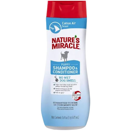 Nature's Miracle Cotton Air Supreme Odor Control Puppy Shampoo is a 4-in-1 solution for your pet's skin and coat. This natural oatmeal shampoo neutralizes odors, deodorizes, cleans, and conditions, providing a comprehensive approach to maintaining your pet's freshness. It instantly neutralizes a wide range of odors upon contact, creating a long-lasting, pleasant scent. This soap-free formula is safe for use with spot-on flea and tick products and contains no dyes or parabens. Plus, your furry friend will love the delightful cotton air scent, leaving behind no lingering "wet dog" smell.