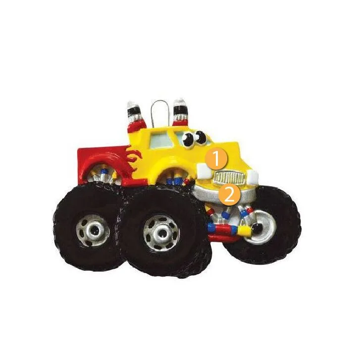 Rudolph & Me Personalized Monster Truck Ornament is a great decoration to add to your tree if your children enjoy playing with them. This ornament features a yellow and red monster truck with big wheels ready to entertain. The open spaces give you a place to write a personalized message or name. Perfect gift for a little one who loves to play with monster trucks!