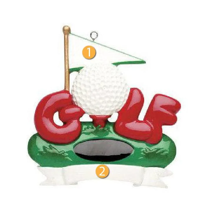 Rudolph & Me Personalized 18th Hole Ornament is a great decoration to add to your tree for someone who enjoys to play this game. This ornament features the word "Golf" in bold letters with a golf ball on a tee set up on the green. The ribbon can act as a white space for you to write a personalized name or message. Great gift idea for a family member or friend who loves to golf!