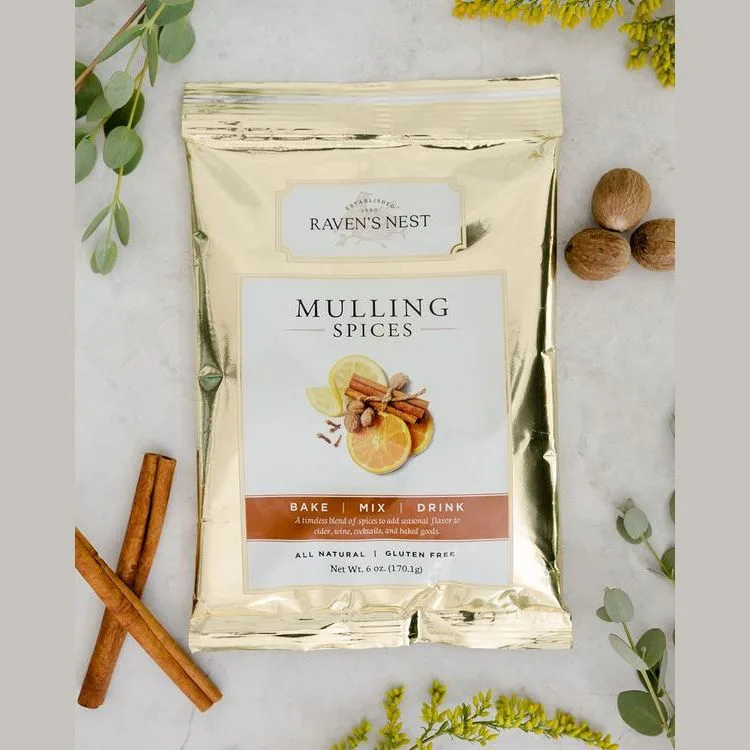 Raven's Nest Mulling Spices is an award winning spice blend that can be used to bake, mix, and drink with. An aromatic blend of cinnamon, nutmeg, clove, orange and lemon. This seasonal blend can be added to ciders, wines, cocktails, and baked goods for some extra flavor. This all natural spice blend is also gluten and preservative free. Comes in a 6 oz. package.