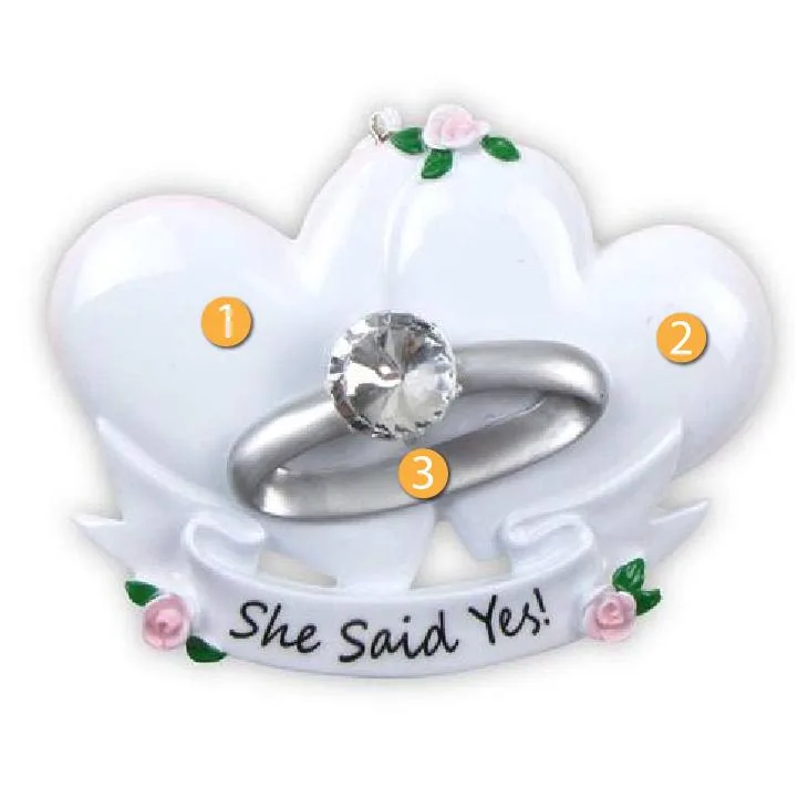 PolarX ornaments are the perfect way to create lasting, loving memories with your family and friends. Their expert style of personalization/customization gives you the opportunity to add any sentiment in a personal and unique way that is sure to touch the hearts of your loved ones. PolarX Personalized Engagement Ring Ornament is a great addition to your Christmas tree for anyone celebrating an engagement. This ornament features a beautiful diamond engagement ring on a white heart background with a banner that reads, "She said yes!" The two white hearts can act as a white space for you to write a name or special message. Great gift idea for a family member or friend who has recently got engaged!