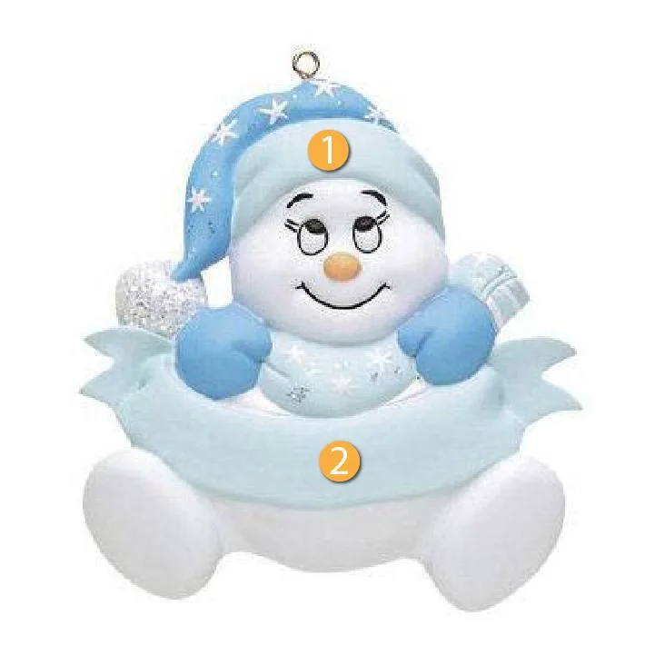 Rudolph & Me Personalized Blue Snowbaby Ornament is a great decoration to add to your tree to celebrate your child's first Christmas. This ornament features a snowbaby in baby blue accents and a matching starry hat and scarf with a ribbon across its body. The blue space on the ribbon gives you an area to write a personalized message or name. Great gift idea for a loved one or friend who recently gave birth and is celebrating their first Christmas together!