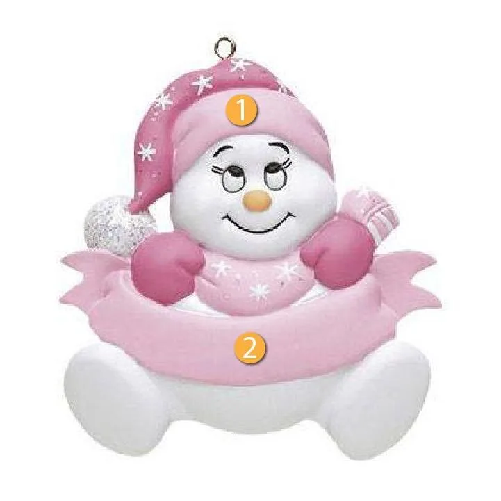 Rudolph & Me Personalized Pink Snowbaby Ornament is a great decoration to add to your tree to celebrate your child's first Christmas. This ornament features a snowbaby in pink accents and a matching starry hat and scarf with a ribbon across its body. The pink space on the ribbon gives you an area to write a personalized message or name. Great gift idea for a loved one or friend who recently gave birth and is celebrating their first Christmas together!
