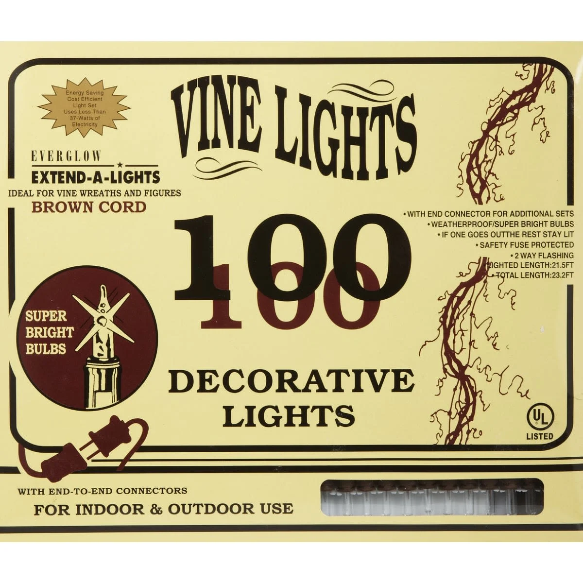 Vine light set ideal for decorating vine wreaths and figures. Features weatherproof, warm white, 2.5 volt bulbs. End connector to connect additional sets. If one bulb goes out, the rest stay lit. Safety fuse protected. 2-way flashing function. UL (Underwriter's Laboratories) listed. No. 2280-02: Bulb Finish: Clear, Number of Bulbs: 100 Bulbs, Bulb Shape: Mini, Bulb Type: Incandescent, Wire Color: Brown, Lighted Length: 21.5 Ft., Length: 23 Ft., Light Function: Flashing, Constant, Bulb Spacing: 2.5 In., Maximum Set Connections: 3 Sets, Indoor/Outdoor: Indoor/Outdoor, Pkg Qty: 1, Package Type: Box
