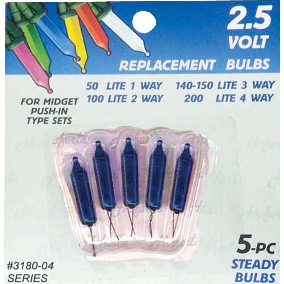 2.5V Mini replacement bulbs. For use with 50-light, 100-light, and 150-light sets. 5-pack card. No. 3180: Type: Mini, Color: Multi, Voltage: 2.5V, Pkg Qty: 5, Package Type: Card No. 3180-06: Type: Mini, Color: Gold, Voltage: 2.5V, Pkg Qty: 5, Package Type: Card No. 3180-04: Type: Mini, Color: Blue, Voltage: 2.5V, Pkg Qty: 5, Package Type: Card No. 3180-03: Type: Mini, Color: Red, Voltage: 2.5V, Pkg Qty: 5, Package Type: Card No. 3180-02: Type: Mini, Color: Clear, Voltage: 2.5V, Pkg Qty: 5, Package Type: Card No. 3180-05: Type: Mini, Color: Green, Voltage: 2.5V, Pkg Qty: 5, Package Type: Card