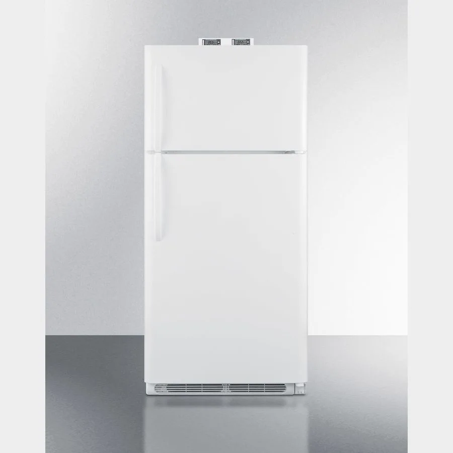 NOTE: Accucold and Summit full-sized CTR/BKRF series refrigerator-freezers are listed on our website with general dimensions that may vary slightly from the actual unit. The BKRF18W is a full-sized refrigerator-freezer specially designed for use in break rooms and other common areas. The large interior offers 18 cu.ft. of storage capacity, with frost-free operation for low maintenance use. The temperature is managed by a dial thermostat, with two NIST calibrated thermometers externally mounted on top of the unit to provide a temperature readout of the current and high/low temperatures in each section to the nearest tenth of a degree. Temperature can be viewed in Celsius or Fahrenheit for added convenience. Each thermometer includes an audible high/low alarm function to warn users if the refrigerator or freezer section goes out of the specified temperature range.Inside, the BKRF18W includes adjustable shelves in the refrigerator compartment and two clear crispers. The door features full-sized storage racks, including two that hold full gallon containers. The upper freezer compartment comes with a full-width wire shelf and two door bins. The BKRF18W features a white finish and user-reversible doors and handles. This unit is also available with a factory installed combination lock and in a stainless steel finish. NOTE: Actual product may vary from the images displayed on this webpage.