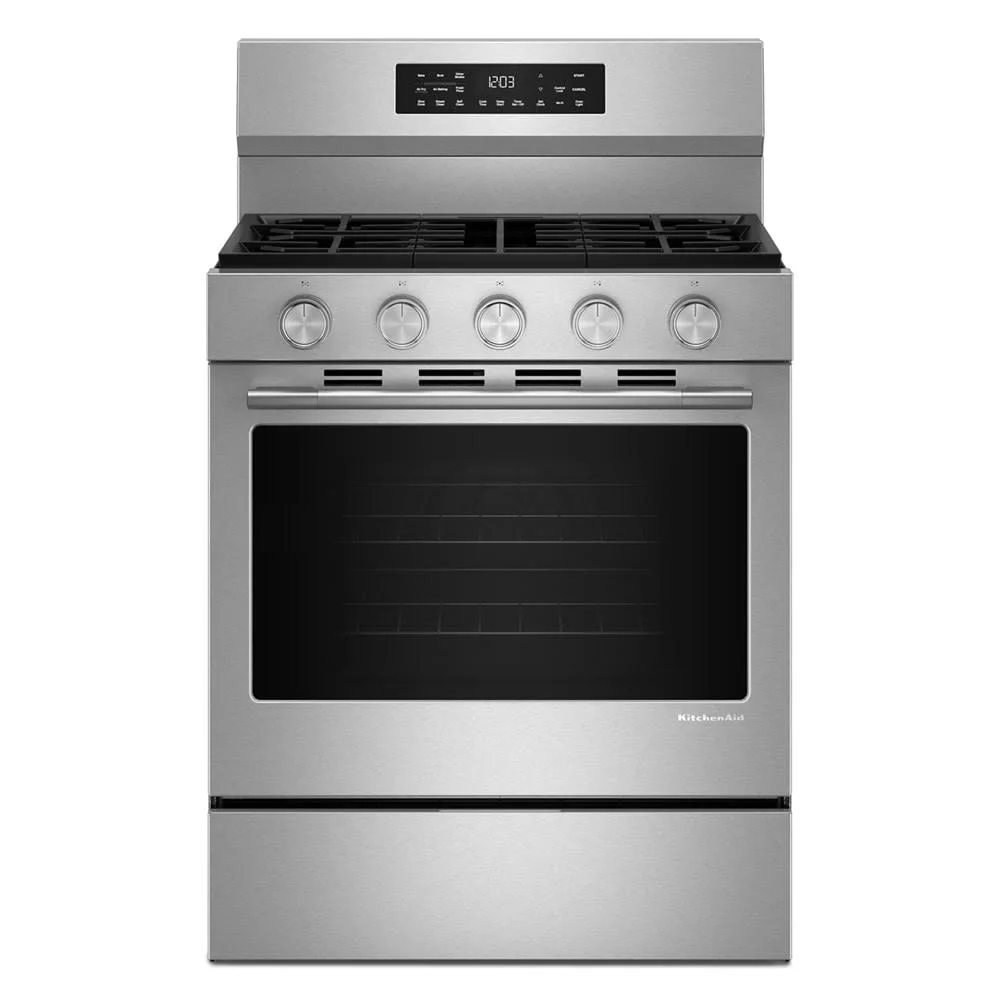 Enjoy a range of possibilities with a KitchenAid 30-inch Gas Range. A spacious 5.0 Cu. Ft. capacity and Rapid Preheat get your oven to 350°F in under 8 minutes*. This Smart Appliance comes with a 12,000 BTU Oval Burner and Convection Cooking Modes that help you achieve consistent results. Even-Heat™ True Convection features a unique bow-tie design with a heating element and a fan that circulates hot air throughout the entire oven, providing consistent results for flaky baked goods, juicy roasts, and caramelized vegetables.