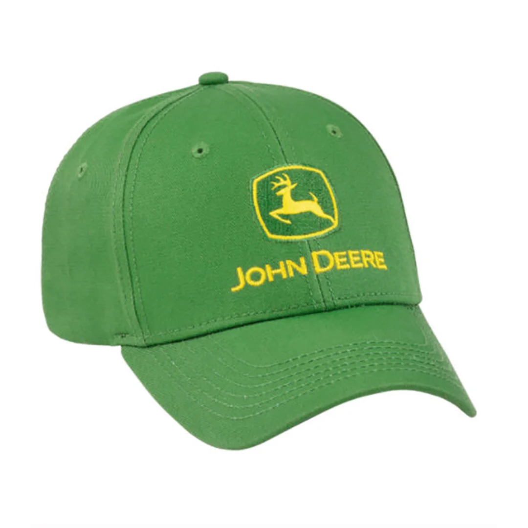 John Deere LP69072 Trademark Cap. This low profiled, structured hat comes in John Deere green and features an embroidered classic John Deere logo on the front. Cap is made with 100% Cotton twill. Fabric strap with metal tri glide closure adjusts to fit most head sizes. An Officially Licensed John Deere Product. Imported