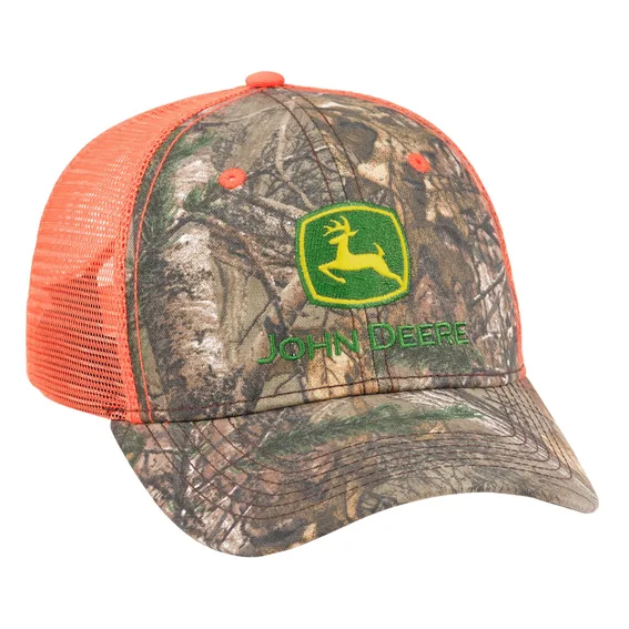 John Deere LP69082 Realtree APX Camo Blaze Mesh Cap. This structured low profile hat has a Realtree camo front panel that features an embroidered classic John Deere logo. Front panel and bill are made with a 60% Cotton/40% Polyester blend. Orange mesh back is 100% Polyester. Adjustable snap closure to fit most head sizes. The Realtree logo may appear in the camouflage pattern. Realtree is a registered trademark of Jordan Outdoor Enterprises, Ltd. An Officially Licensed John Deere Product. Imported