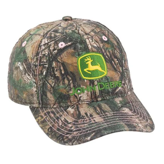 John Deere LP70005 Ladies Realtree AP Xtra Camo Cap. This unstructured low profile hat is made with cotton twill with a Realtree Camo pattern with contrasting pink stitching. Front panel features an embroidered classic John Deere logo. Cap is made with a 60% Cotton/40% Polyester blend. Hook & loop closure adjusts to fit most head sizes. The Realtree logo may appear in the camouflage pattern. Realtree is a registered trademark of Jordan Outdoor Enterprises, Ltd. An Officially Licensed John Deere Product. Imported