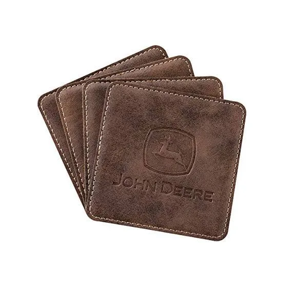 John Deere LP76898 4 Piece Coaster Set. Includes four stitched brown leather coasters embossed with the John Deere logo, plus a matching holder. Coasters are polyurethane-coated for moisture resistance and have skid-resistant bottoms. 4" wide x 4" high. An Officially Licensed John Deere Product. Imported
