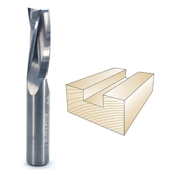 Whiteside RU4100S Slow Spiral Upcut Router Bit. Used primarily for routing plastics. Has an up-cutting action that pulls chips up and out of mortises, slots, and holes. Ideal for deep cutting applications where good chip clearance is a must. The spiral shape provides a shearing action for extra smooth cuts - regardless of grain direction. Solid carbide and double fluted. Whiteside Machine Company - Claremont, North Carolina.
