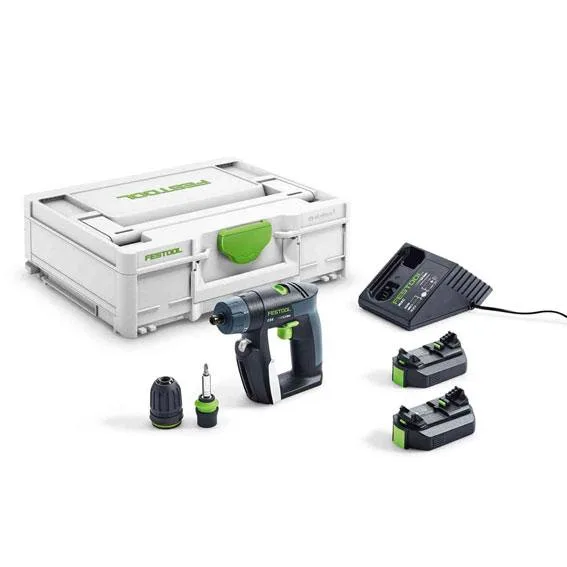 The popular Festool CXS Compact Cordless Drill has been updated with a larger capacity 2.6 Ah Lithium Ion battery, and an integrated Fuel Gauge. This newer battery is more compact and is compatible with older model CXS drills, plus the new version is back compatible to units with older existing 1.5 Ah batteries. The Fuel Gauge is integrated into the LED module for a quick reference of remaining battery life. Additionally this update version now is equipped with a larger 3/8" (10mm) chuck. Plus you get all of the same great features that CXS users have come to love, including the 3-in-1 Fastfix Chuck System, which includes the Centrotec quick-change chuck, a more traditional Keyless for smooth shank bits, and a Right Angle Attachment (sold separately from the Basic version, but included in the Set version) for getting into corners and tight spaces. Additional features include the the 12 position clutch for selecting just the right amount of force for drilling and driving, a bright LED lamp for seeing bits and fasteners clearly, magnetic bit storage to keep drivers handy, and a reversible belt clip to keep your drill right - or left - at your side. GermanyCXS Plus Includes : CXS Drill; two 2.6 Ah Batteries with MXC Charger; Centrotec Chuck; Centrotec Bit Holder; FastFix Keyless Chuck; and a new generation Systainer3 SYS3 M 137*.*NOTE : The Systainer3 is fully compatible with current T-LOC Systainers. And, like the T-LOC Systainer, it can be latched on top of the Classic Systainer (going back to 1993).VIDEO